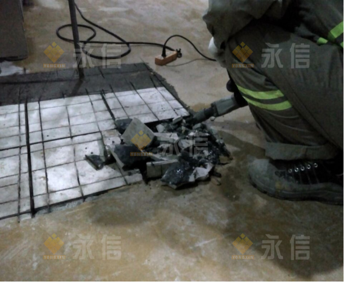 當(dāng)天,按照既定的施工計劃,現(xiàn)場的施工內(nèi)容是在人流通道區(qū)去除環(huán)氧以及基層處理、灌裝間破損、空鼓地磚破除聚合物修復(fù)及地磚錨固設(shè)置等。